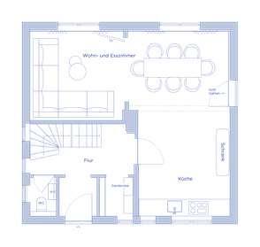 Vom offenen Wohn-Esszimmer haben Sie Zugang zur Terrasse, die eingebettet in einem wunderschönen großen Garten liegt.