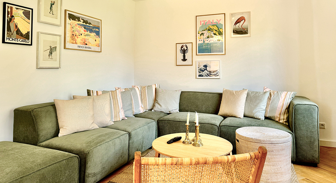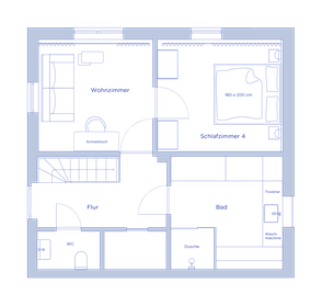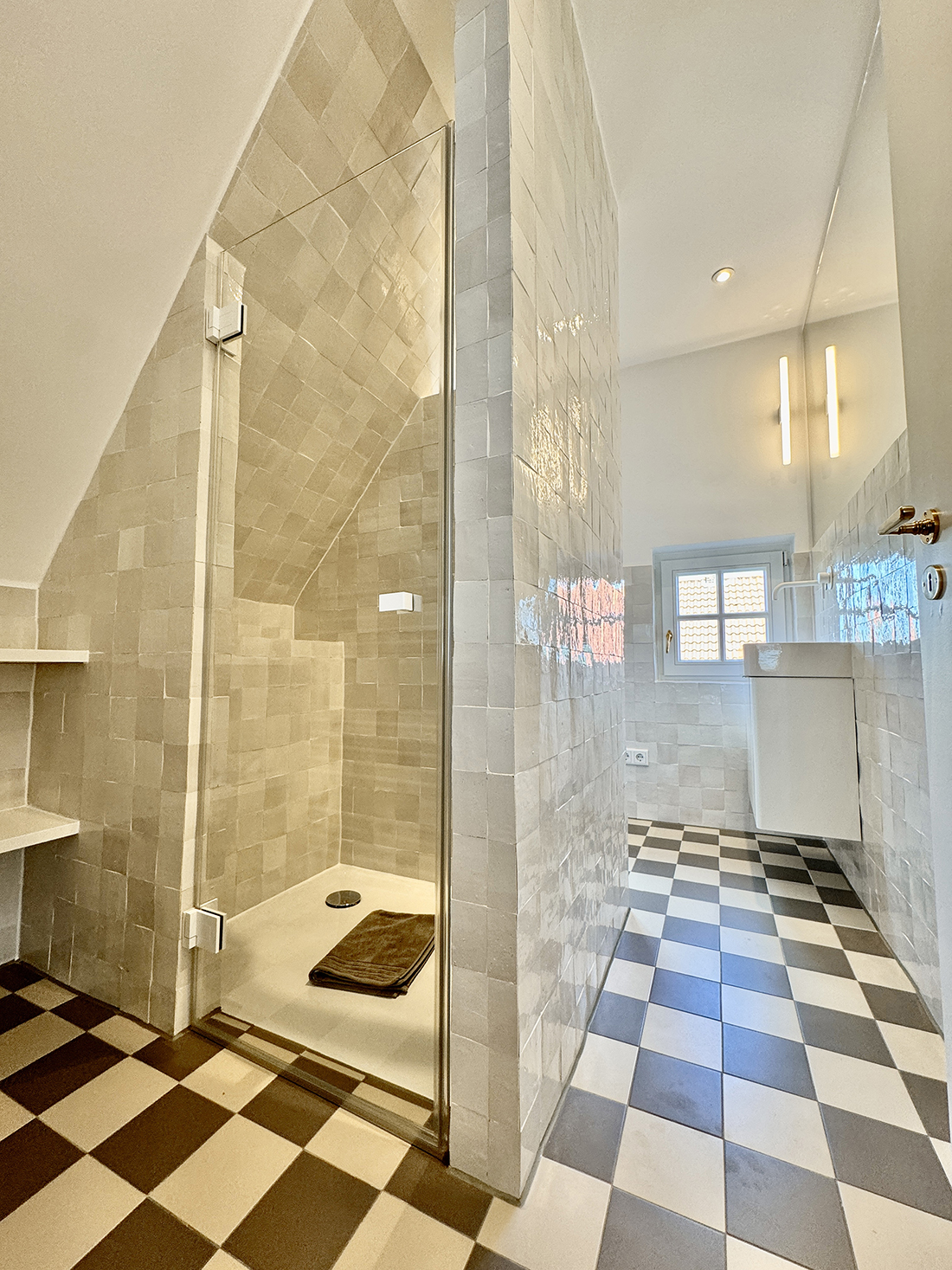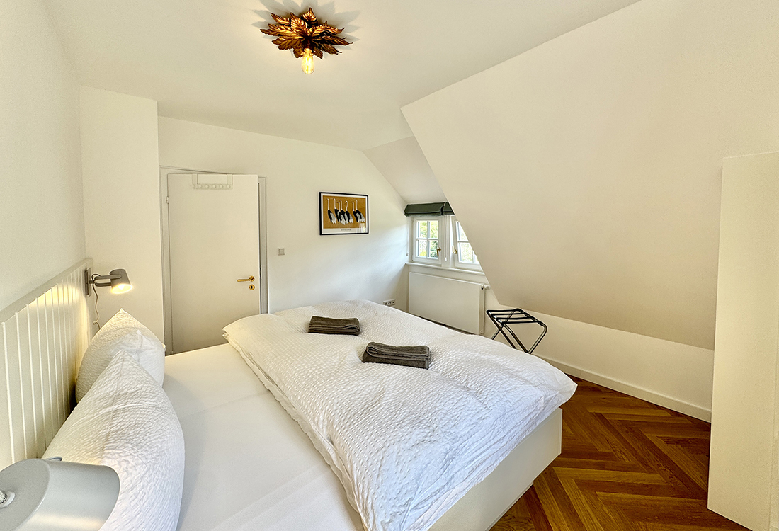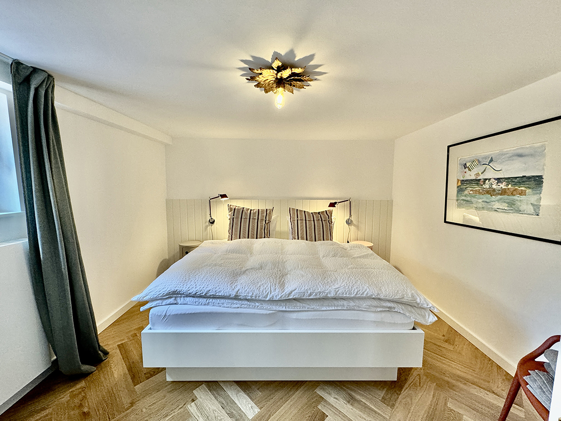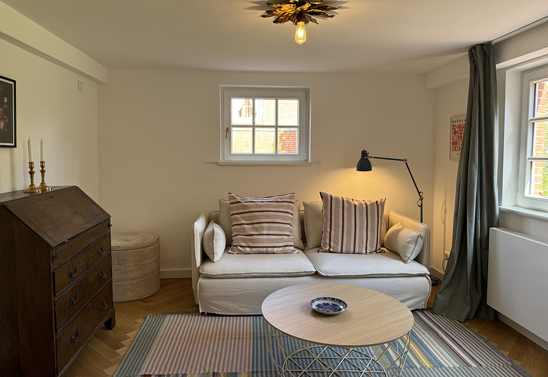 Im Souterrain finden Sie ein Schlafzimmer, ein kuscheliges Wohnzimmer mit Sofa und Schreibtisch, ein Badezimmer mit großzügiger Dusche und ein separates WC.