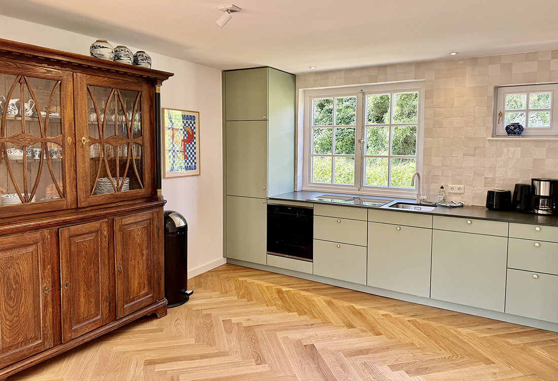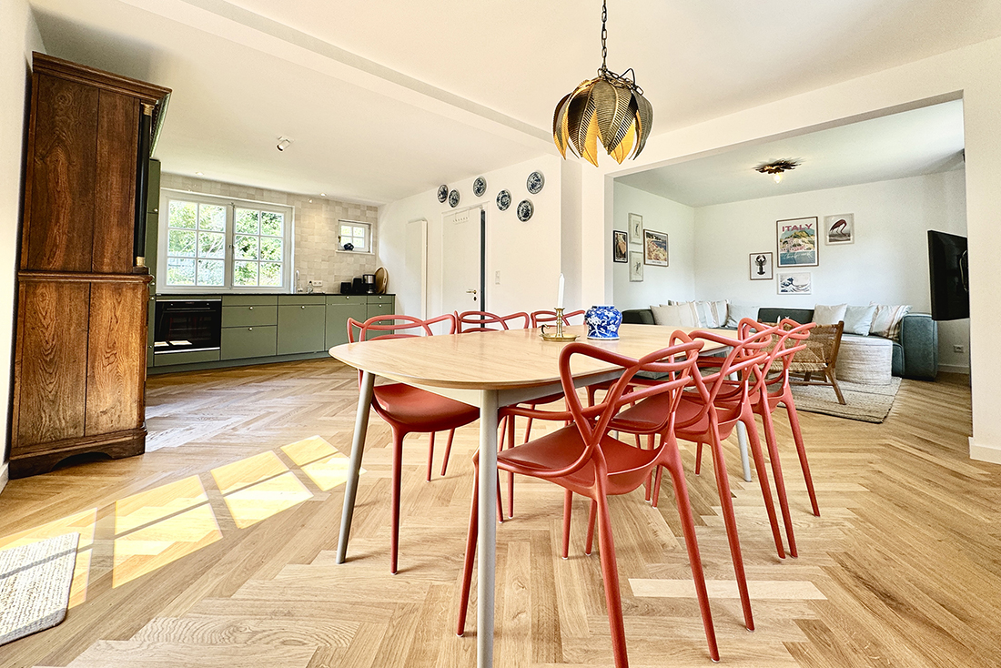 Das Erdgeschoss verfügt über eine offene und gut ausgestattete Küche mit großem Esstisch, der viel Platz bietet für fröhliche Runden. Das Wohnzimmer lädt mit gemütlicher